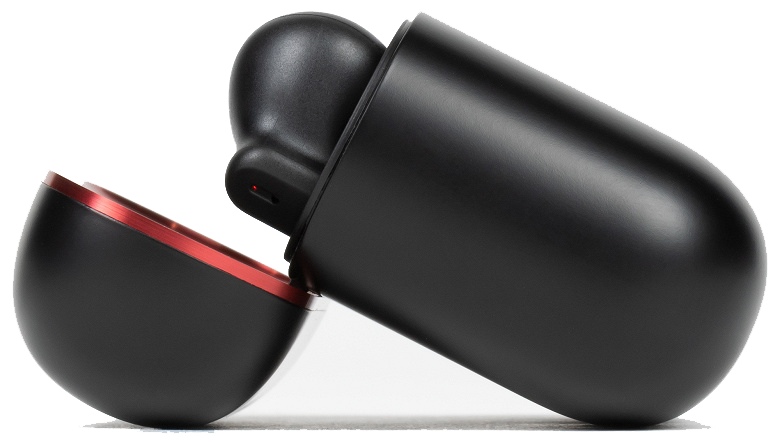 Бокс под наушники имеет базовую, обтекаемую форму черного цвета. На лицевой стороне которого можно увидеть индикатор заряда аккумулятора и гравировку с самим логотипом производителя. Интересно, что накладки не полностью черные, а с красной полоской внутри. Конечно, ее не будет видно во время использования, но расцветка красивая — и подходит под стиль кейса.