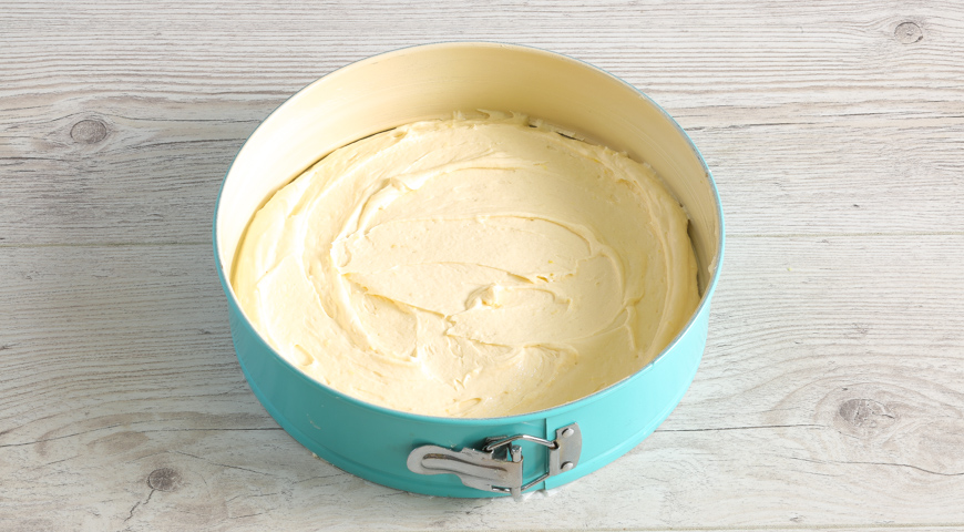 Получившееся тесто разделите пополам. Первую часть выложите в форму диаметром 22-24 см, выстланную бумагой для выпечки. Выпекайте около 20 минут до золотистого цвета. Таким же образом испеките второй корж для торта.