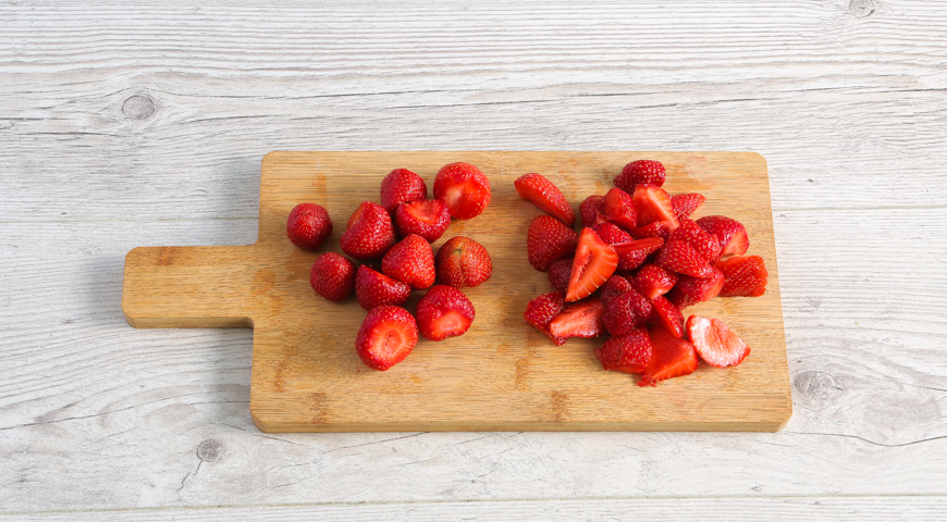Клубнику для торта вымойте и обсушите, разложив на бумажном полотенце. Ягоды разрежьте на половинки или четвертинки. Джем или варенье слегка нагрейте и перемешайте с клубникой.