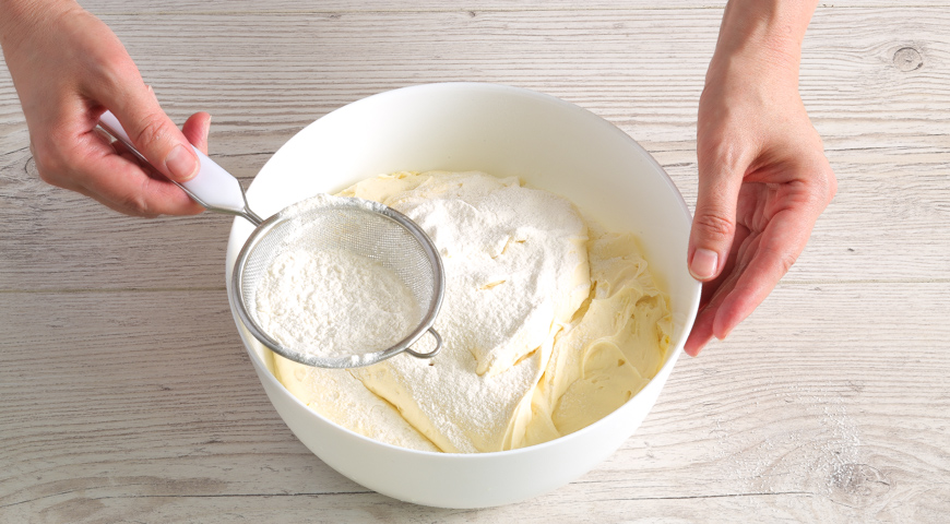 Духовку нагрейте до 180°C. Мягкое сливочное масло взбейте миксером с сахарной пудрой до консистенции легкого крема. По одному добавьте яйца, после каждого тщательно взбивая массу.