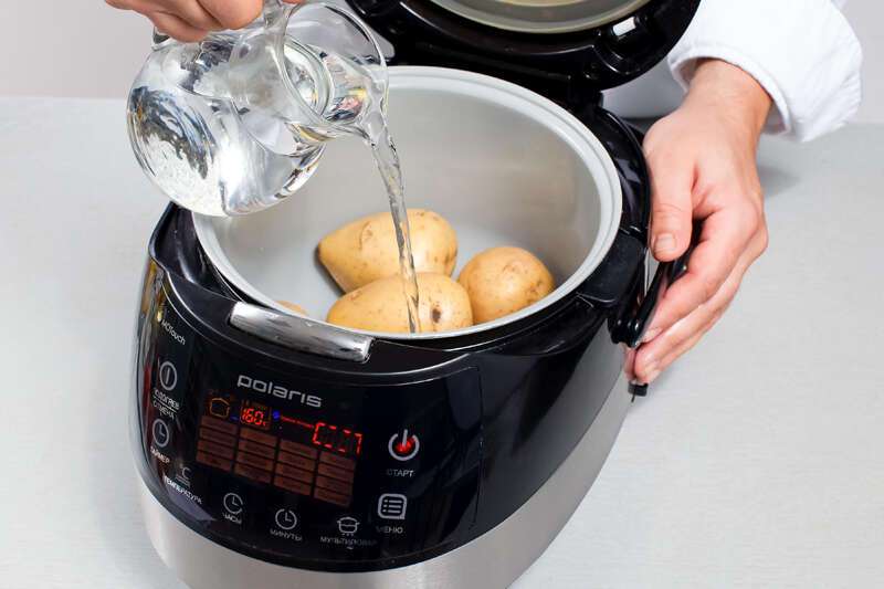2. Картофель вымыть щеткой, положить в чашу мультиварки, залить водой, добавить 1 ч. л. соли. Включить режим «Мультиповар», установить температуру 160 °С. Готовить в течение 25 минут, после чего картофель вынуть, отвар слить.