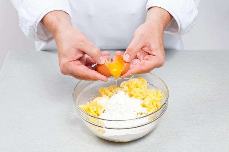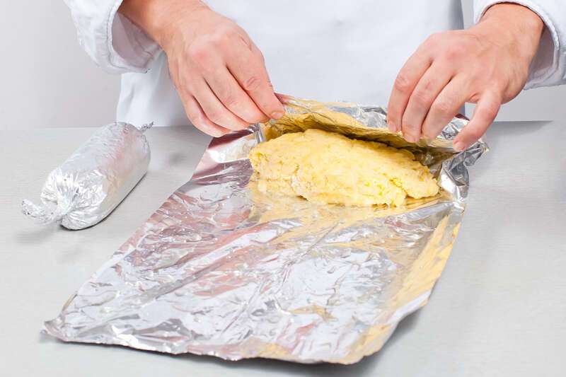 3. Очистить картофель и натереть на крупной терке. Добавить сливочное масло, муку, яйца и соль и перемешать. Разделить тесто на две части и придать форму цилиндров. Смазать фольгу растительным маслом и плотно завернуть в нее картофельное тесто.