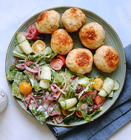 Ингредиенты, которые нужны для этого рецепта: небольшой кочан салата ромен, 100 г помидоров черри, огурец, красная луковица, 6 маслин каламата без косточек, 1–2 финика без косточек, 100 г греческого йогурта, 1 ст. л. оливкового масла, 1 ст. л. винного уксуса, 600 г фарша классического «Индилайт», 50 г панировочных сухарей, 2 зубчика чеснока, соль, свежемолотый черный перец.
