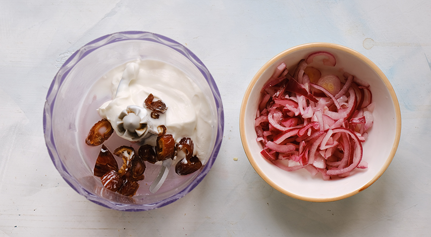 Лук нарежьте полукольцами, посолите и сбрызните уксусом. Когда лук станет мягким, отожмите его и переложите на тарелку, жидкость сохраните. Смешайте жидкость из-под лука с йогуртом, добавьте нарезанный финик, пробейте блендером до образования густой гладкой заправки.