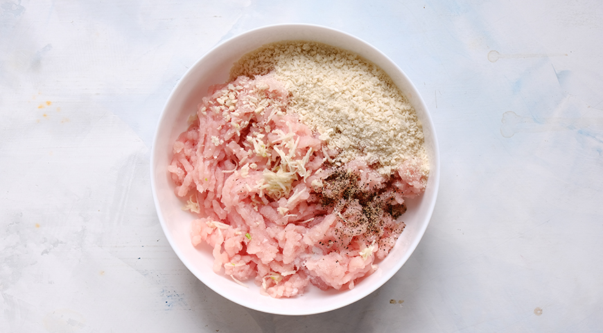 В миске смешайте фарш из индейки, измельченный чеснок, панировочные сухари, приправьте солью и перцем.
