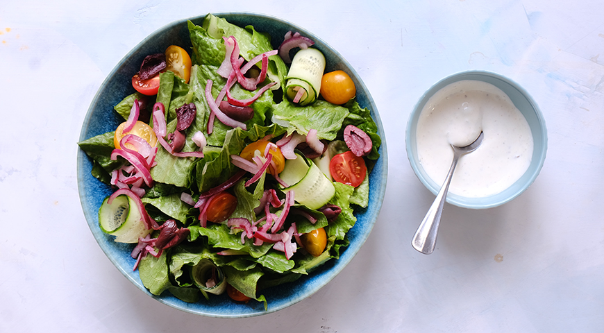 Нарежьте салат ромен и выложите в миску. Добавьте помидоры черри, маслины, разрезанные пополам, и маринованный лук. Нарежьте кружками огурцы и добавьте к салату. Полейте салат йогуртовой заправкой и подавайте с фрикадельками.