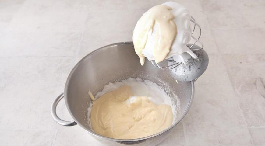 В другой миске взбейте белки до появления пены. Добавьте оставшийся сахар и взбейте до мягких пиков. Переложите крем из маскарпоне к взбитым белкам и аккуратно перемешайте лопаткой, чтобы масса оставалась воздушной.