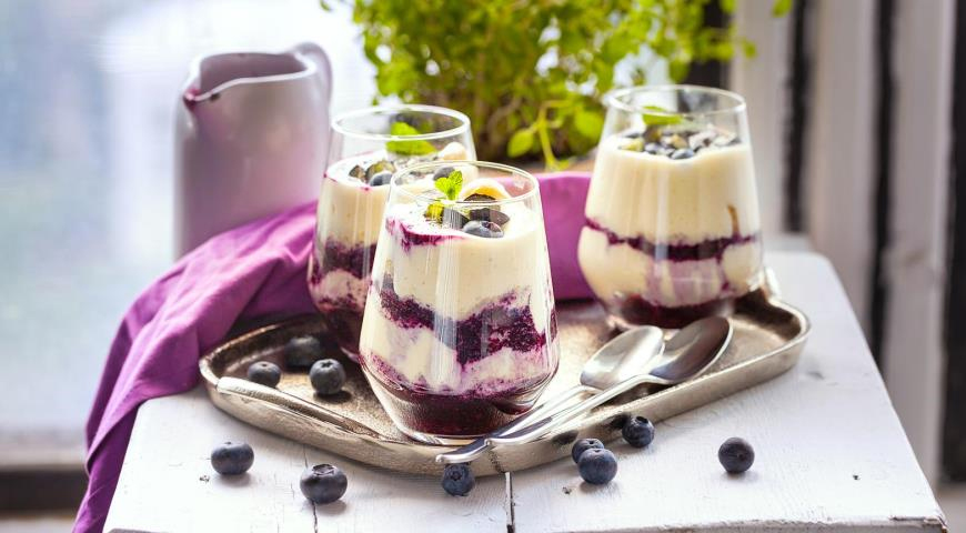 Традиционная кофейная версия тирамису уже давно нашла своих почитателей. Для легкой версии десерта мы пропитали печенье в черничном пюре. Получилось очень вкусно, точно не хуже кофейного оригинала.