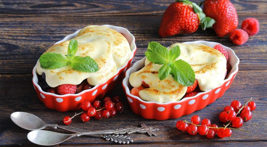 Выложите ягоды в керамические формочки для запекания (крупную клубнику разрежьте на 2–4 части). Залейте ягоды соусом. Посыпьте оставшейся сахарной пудрой и поставьте под разогретый гриль на 1–2 мин. или карамелизуйте при помощи газовой горелки. Немедленно подавайте к столу.
