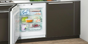 Принцип встраиваемой техники заключается в том, что она полностью скрывается в кухонном гарнитуре. У них нет декоративной панели, но очень важно подобрать технику по размеру шкафа. Встраиваемый морозильник может быть установлен рядом со встроенным холодильником, или в нижнюю часть кухонного гарнитура. Морозильные шкафы бывают полноразмерные и компактные. Первый вид по своим габаритам не отличаются от классических холодильников. В ширину и глубину они составляют около 55–60 см, а в высоту могут достигать 190 см. Общий полезный объём таких морозильников составляет около 200 литров. Если вам нужен небольшой аппарат, то вам подойдут компактные модели, которые отличаются небольшими размерами и показателями вместимости. Обычно их помещают под столешницу. Высота таких аппаратов составляет не более 90 см при ширине и глубине около 55 см. Объём компактного встроенного морозильника — около 80 литров. Если вы решили приобрести такую модель, учтите, что при установке необходимо соблюдать определённый промежуток до духовки или варочной панели — примерно 30–50 см.