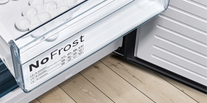 Более современные модели идут с системой разморозки No Frost. Здесь конденсат из герметичной камеры направляется в специальный отсек, откуда испаряется благодаря теплу, которое исходит от компрессора. Благодаря такой системе устройство работает в автоматическом режиме. Внутри встраиваемых моделей находятся вентиляторы, которые полностью вытягивают влагу. Именно поэтому микроклимат в камере становится более сухим, из-за чего продукты нужно упаковывать тщательно, чтобы они не начинали высыхать и заветриваться. Такая система помогает увеличить срок службы техники