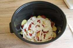 Шаг 8. Помидоры черри разрезаем на 3 части, выкладываем поверх картофеля .