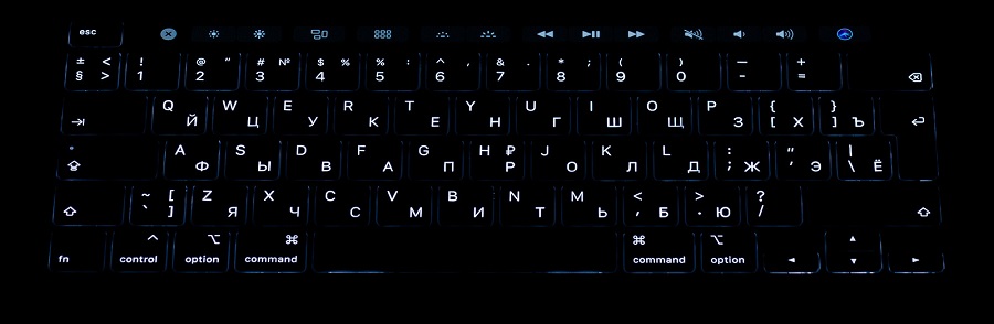 В темноте клавиатура подсвечивается, и видны все буквы и цифры.