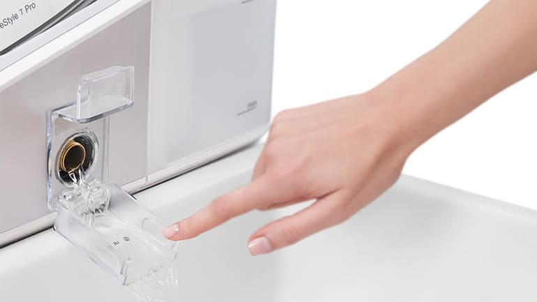 Благодаря системе FastClean, для очистки парогенераторов Braun, не нужно ничего, кроме воды. В основном блоке парогенератора есть встроенная сетка – она собирает 59% накипи и продлевает срок службы прибора. Очищать внутренности тоже просто — надо залить 500 мл воды и открыть специальный клапан сбоку — вся накипь выйдет вместе с водой. Затем нужно включить парогенератор и нажать кнопку «Очистка системы».