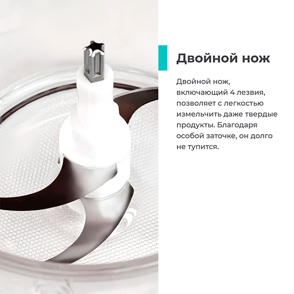 Мощность: 500 Вт / Материал ножа: Металл / Количество насадок: 1 / Особенности: Система четырех лезвий из нержавеющей стали для быстрого и точного измельчения. Легкое управление одной рукой с двумя скоростями, просто увеличьте давление для большей эффективности.