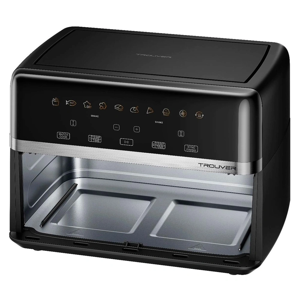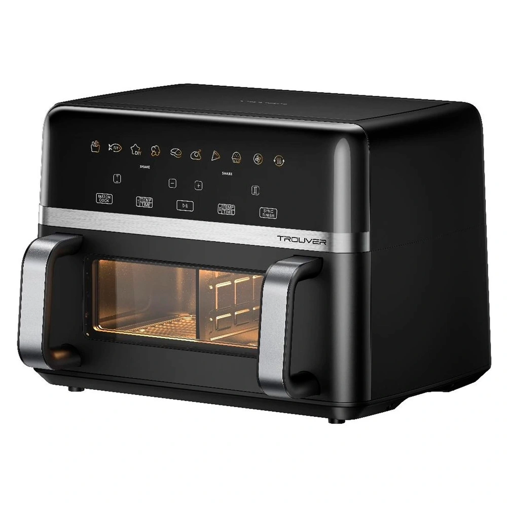 Керамическое покрытие без PFOA, металлическая камера, FlexZone 10 л (5+5), режим SyncFinish, мощность 2800 Вт, Hot Poly‑Air 360°, смотровое окно с подсветкой, Smart Pause, посудомойка, до 88% меньше жира