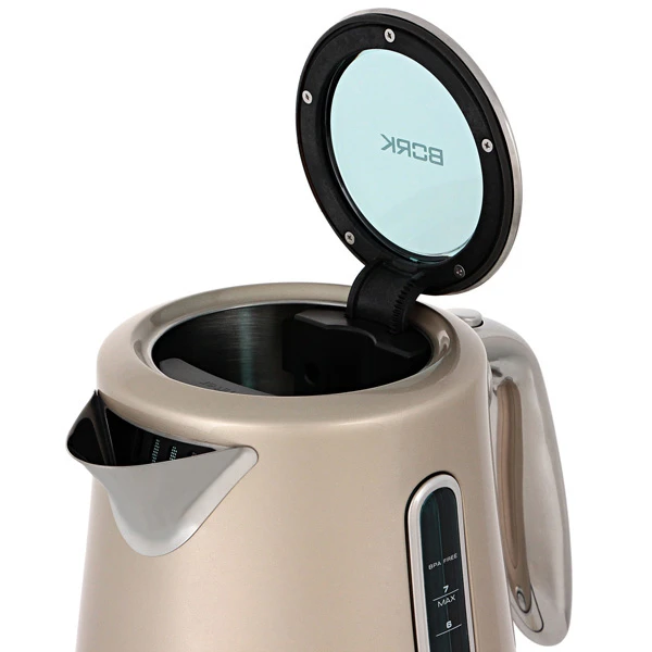 Колба чайника из нержавеющей стали отличается прочностью и долговечностью. Изящная модель в корпусе оттенка шампань с хромированной ручкой отлично дополнит интерьер вашей кухни.