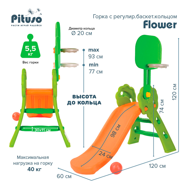 Продукция Pituso (Питусо) разработана с учетом свободолюбивого характера малышей и энергичности его активных родителей. Ничто не помешает вам и вашему ребенку открывать все многообразие мира. А надежность, экологичность, новые дизайнерские решения и качество продукции могут засвидетельствовать родители многих стран мира. Характеристики размер - 115*65*120 см изготовлена из пластика специального крепления к земле не имеет для домашнего использования устойчивая привлекательная форма закрытые ступени (защита ребенка от проваливания ножек) легкая и быстрая сборка максимальная нагрузка – 40 кг для детей от 3 до 7 лет