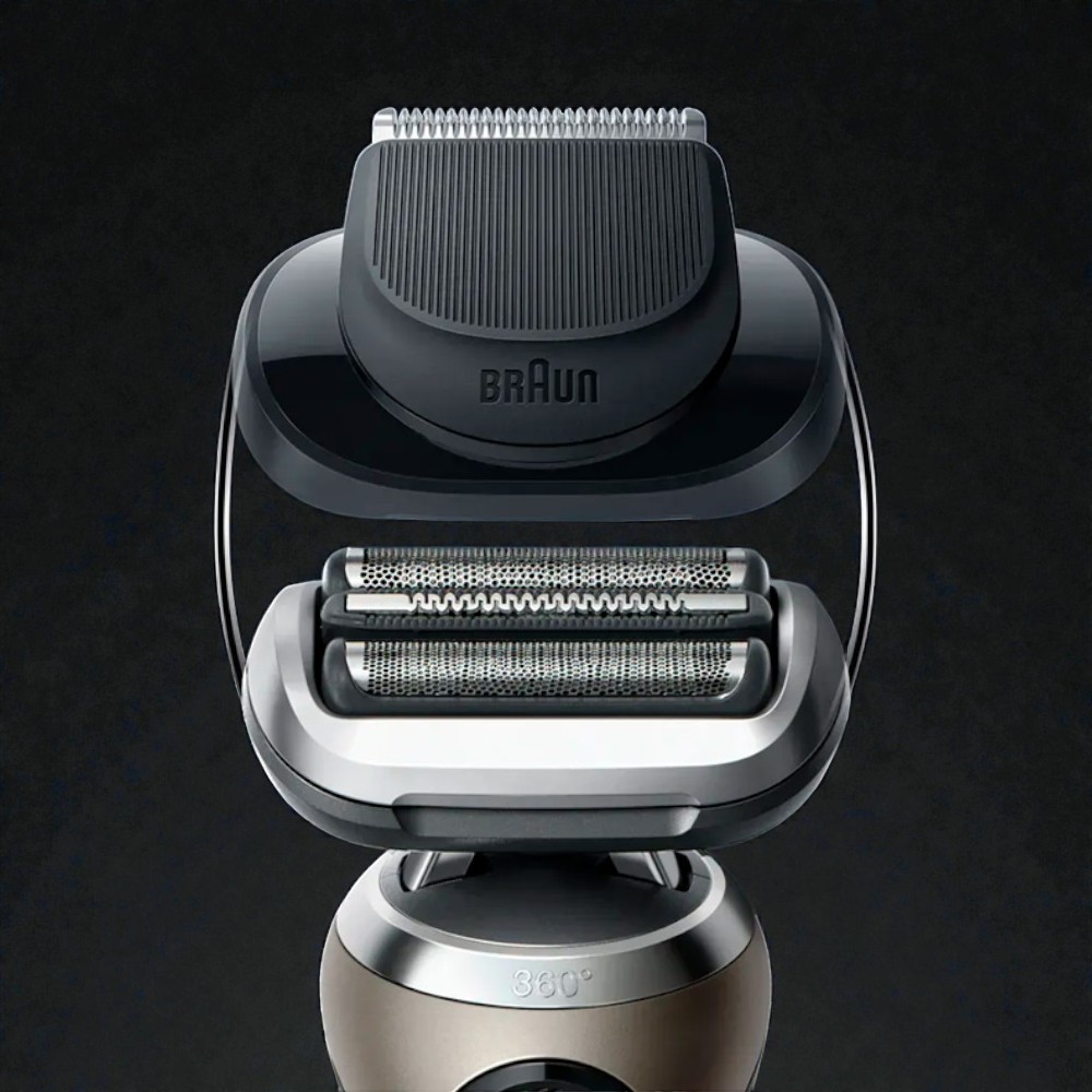 Сеточная система бритья поддерживает как сухой, так и влажный режим. Три плавающие головки с технологией 360° Flex точно повторяют контуры лица, обеспечивая плотный контакт с кожей даже в сложных зонах. Интеллектуальная технология AutoSense автоматически подстраивает мощность под густоту щетины, обеспечивая равномерный результат без лишнего давления.