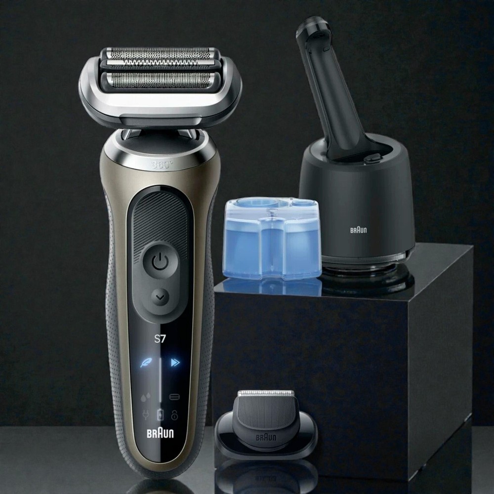 Электробритва Braun Series 7 72-c, станция очистки Clean&Charge, картридж с чистящей жидкостью, зарядный адаптер, дорожный чехол, защитная крышка, щёточка для чистки, инструкция