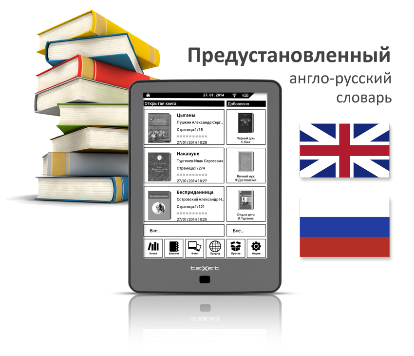 В память новой электронной книги загружена мини-библиотека – подборка лучших произведений на русском и английском языках. С легкостью читать последние поможет предустановленный англо-русский словарь. Для просмотра перевода достаточно выделить слово в тексте. Полиглоты могут самостоятельно расширять лексическую базу устройства за счет новых словарей.