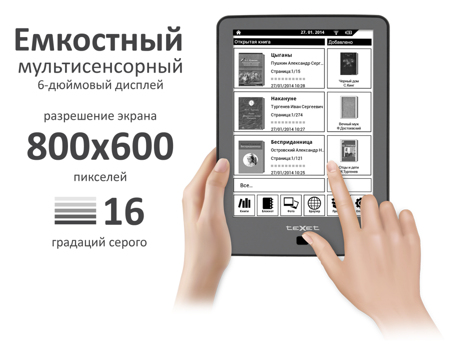 Современные технологии позволили значительно сократить дистанцию между классической электронной книгой и другими девайсами. Пользователям teXet TB-176FL не нужно привыкать к механическому управлению устройством – новинка оснащена емкостным мультисенсорным дисплеем и так же быстро реагирует на прикосновения, как смартфон или планшет. Одним движением можно перелистывать страницы, удобно масштабировать текст, делать закладки, сохранять цитаты.