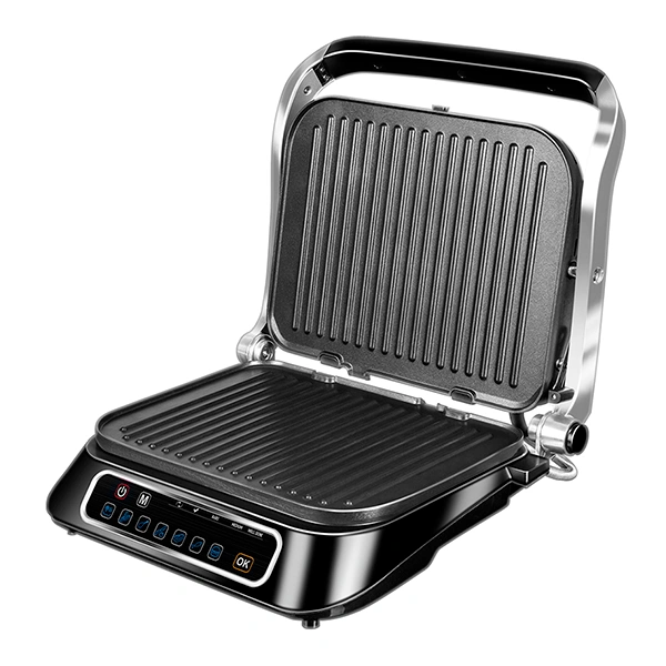 Специальный механизм позволяет раскрыть гриль на 180° и готовить на открытых панелях, используя гриль в качестве барбекю жаровни. Таким способом удобно делать закуски барбекю, овощные гарниры гриль.