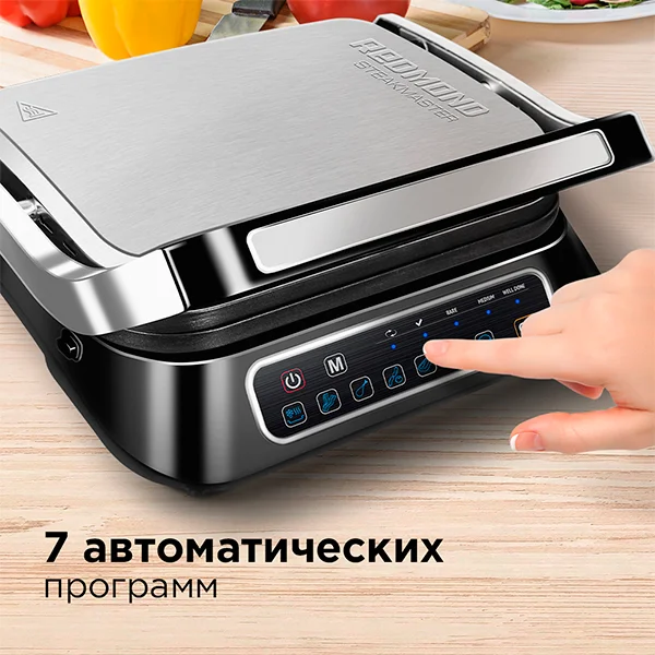 Выбирал между данной моделью и тефалем Optigrill. В итоге консультант переубедил и склонил к данной модели, чему если честно благодарен. Стейки реально "запечатываются" за счет встроенного тена, масло почти не течет с мяса, получаются сочными. У тефали тен не встроенный был, и маслосборник большой. Да и ценник в разы больше, так что решили взять редмонд. Пока пользуемся 2 месяца, покупкой довольны. Пробовали жарит мясо, колбаски, рыбу, овощи. Жена готовила по рецепту что шел в комплекте печенье - получилось неплохо. Нареканий пока нет. Единственное, не понравился противень что в комплекте был. Он какой то дешевый, тонкий. Но в целом на сам гриль никак не влияет. Автоматические программы работают как надо, заморачиваться не нужно. Даже такому не опытному как я. Жарили еще как на барбекю овощи, разложив полностью, вышло вкусно. Панели отмываются без усилий. Единственное с рыбой пришлось провозится отмывая, на будущее решили готовить в фольге. В общем рекомендую. Среди конкурентов по параментам на одном уровне, а за счет ценника выиграет в разы.
