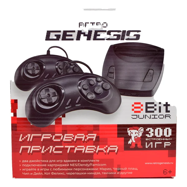 Стационарная игровая приставка Retro Genesis 8 Bit Junior – компактная игровая приставка с поддержкой игр 8 бит, предназначенная для подключения к телевизору. Приставка оснащается двумя проводными джойстиками и позволяет прямиком из коробки играть в игры, предназначенные для игры вдвоем. Слот для картриджей позволяет подключать игровые картриджи типа 8bit. Питание устройства осуществляется через разъем питания microUSB, который на данный момент является универсальным стандартом, поэтому является легко заменяемым. Для большей аутентичности рекомендуется подключение к кинескопным экранам, на которых изображение выглядит наиболее комфортно для глаз.
