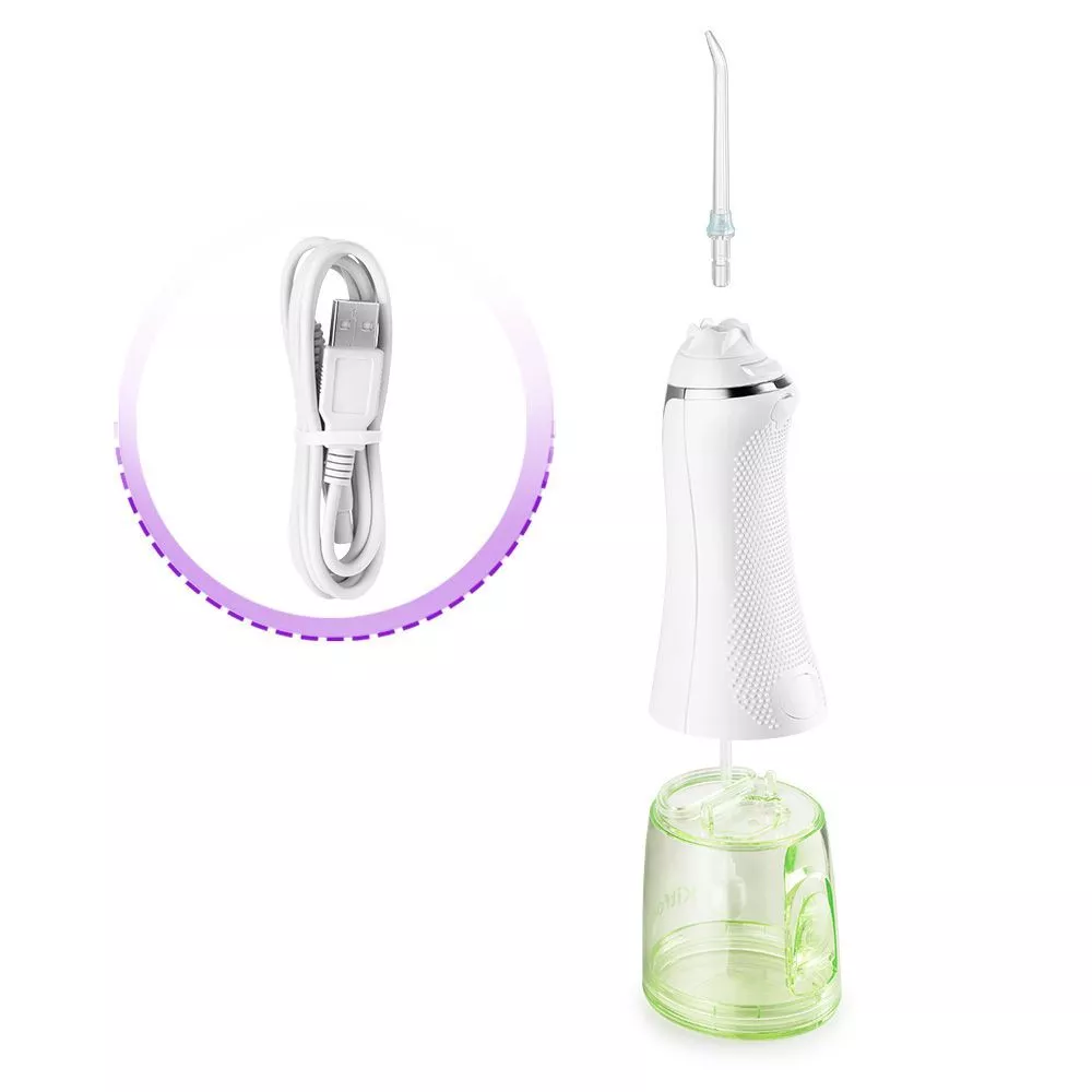 Ирригатор, струйная насадка — 2 шт, насадка для удаления зубного камня и налета из-под линии десны, насадка с щеточкой для удаления налета, насадка для чистки языка, резервуар для воды, USB-шнур с нестандартным разъемом, сумочка.