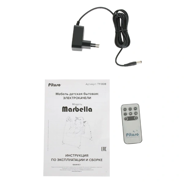 Электрокачели, дуга с игрушками, зарядное устройство, пульт ДУ, антимоскитная сетка, инструкция