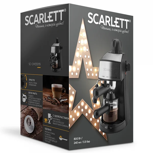 Кофеварка SC-CM33019 позволяет приготовить крепкий эспрессо, ароматный капучино, мягкий латте, при этом управление максимально понятное и удобное. Для формирования кофейной «таблетки» в комплекте идет мерная ложка с уплотнителем. Насыпьте в фильтр нужное количество кофе, при помощи капучинатора взбейте молоко до нужной плотности, а после просто наблюдайте, как кофейник из термостойкого стекла наполняется горячим напитком. Благодаря большому фильтру и емкости резервуара 240 мл вы сможете приготовить сразу несколько порций. Кофеварка SC-CM33019 входит в серию кухонной техники Goldstars, поэтому выполнена в стильном черном цвете с металлическими вставками.