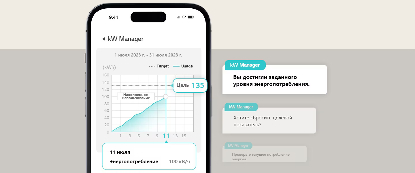Если общее потребление электроэнергии в течение заданного периода превышает установленный лимит, функция kW Manager отключается, и устройство возвращается в обычный режим работы. Вы получите уведомление об этом в приложении LG ThinQ™.