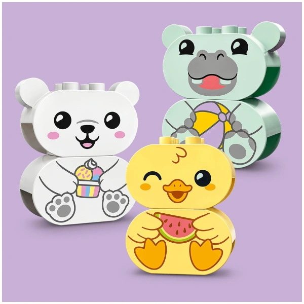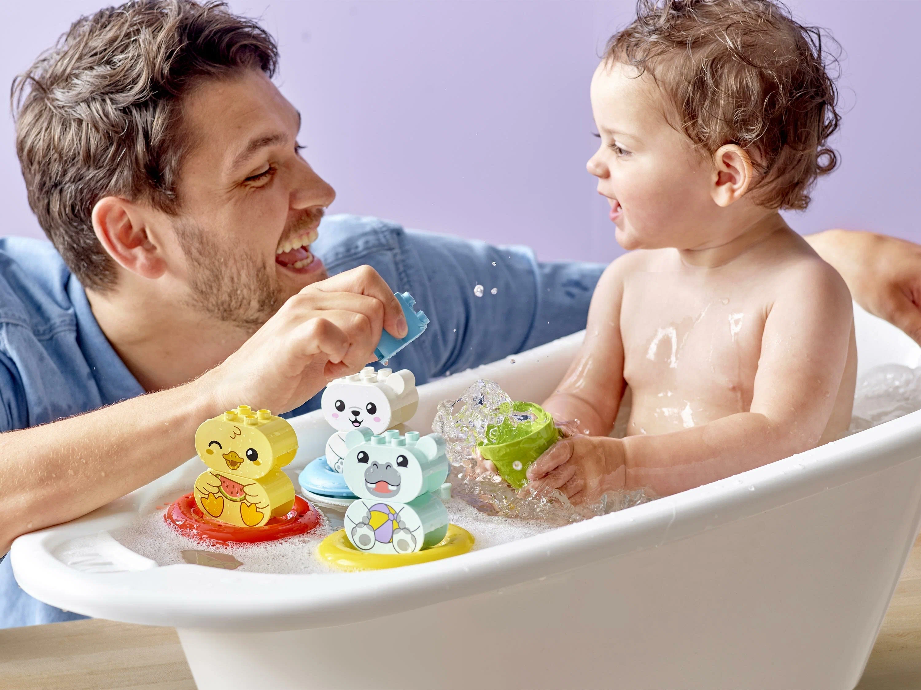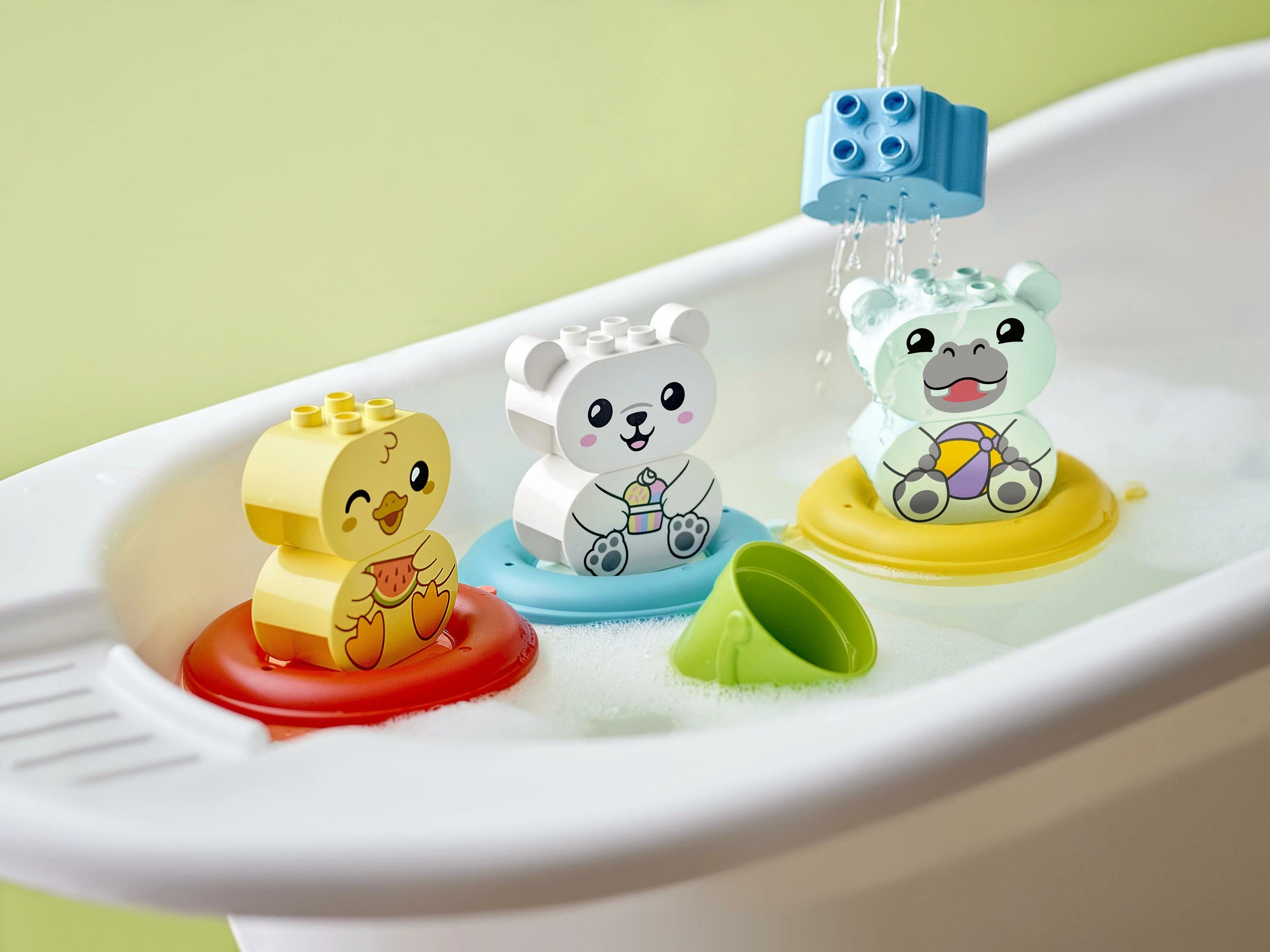 Малыши собирают и учатся, наливая и разбрызгивая воду, с тремя животными в плавучих кольцах, ведром и облаком, из которого идет дождь.
