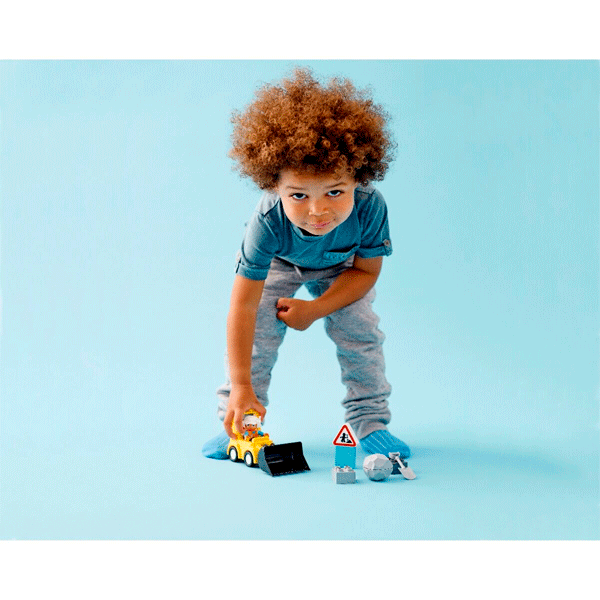 Фигурка строительного рабочего и модель бульдозера для детей Этот забавный бульдозер с фигуркой строительного рабочего в светоотражающем жилете предоставляет малышам и их родителям великолепную возможность конструировать модели и играть вместе. Катая бульдозер по строительной площадке и поднимая и опуская булыжник в его ковше, дети будут развивать мелкую моторику. Будьте осторожны: булыжник может расколоться в любой момент.