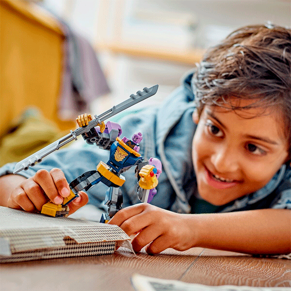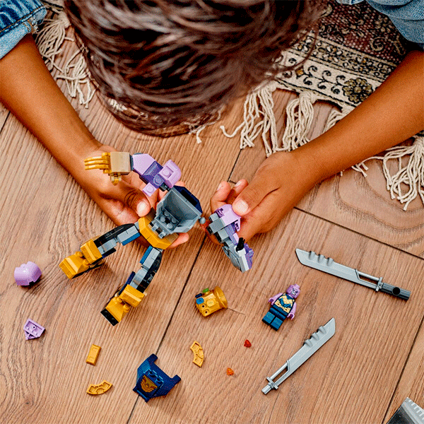 Танос LEGO аккуратно помещается в открывающуюся кабину робота. Полностью сочлененные руки, ноги и пальцы позволяют его позиционировать и позировать для творческих возможностей игры и демонстрации. Знаменитый двусторонний меч персонажа, Перчатка Бесконечности и Камни Бесконечности также входят в комплект, чтобы приключения никогда не заканчивались.