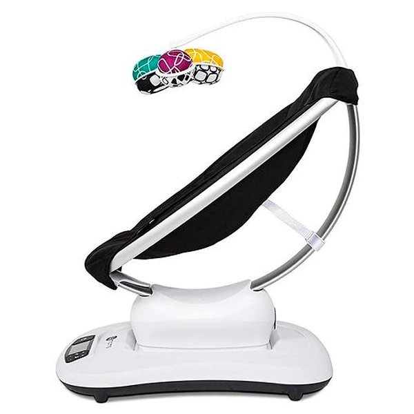 Интенсивность и выбор режима работы mamaRoo регулируются при помощи простого и понятного дисплея. Конструкция оснащена удобной поворотной дугой с подвесными игрушками. Простые на первый взгляд двусторонние игрушки из ткани – результат аналитической работы специалистов. Комбинации цветов, форма игрушек и высота, на которой они подвешены, подобраны с учетом особенностей зрительного восприятия младенцев с рождения. В новой модели mamaRoo 4.0 двусторонние игрушки включают в себя зеркальце, шуршащие элементы и погремушку. Для глаз новорожденных более комфортными являются черно-белые цвета (одна сторона игрушек), а для малышей постарше – более яркие и красочные детали (вторая сторона).