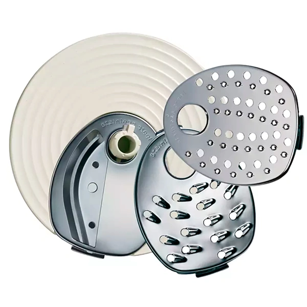 Комбайн, Вставка для средней шинковки, вставка для нарезки ломтиками среднего размера, средняя вставка для нарезки картофеля, диск для приготовления эмульсий, нож из нержавеющей стали, гарантийный талон, инструкция