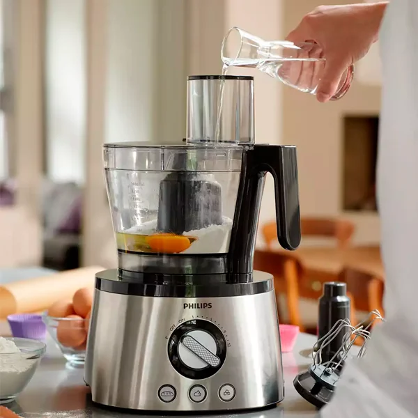 Комбайн, Ножевой блок S-образной формы, Соковыжималка для цитрусовых, Насадки для нарезки толстыми ломтиками,с двумя венчиками, мелкой шинковки, нарезки тонкими ломтиками, крупной шинковки, Кувшин, Насадка для замешивания теста, Двусторонний диск, Лопатка