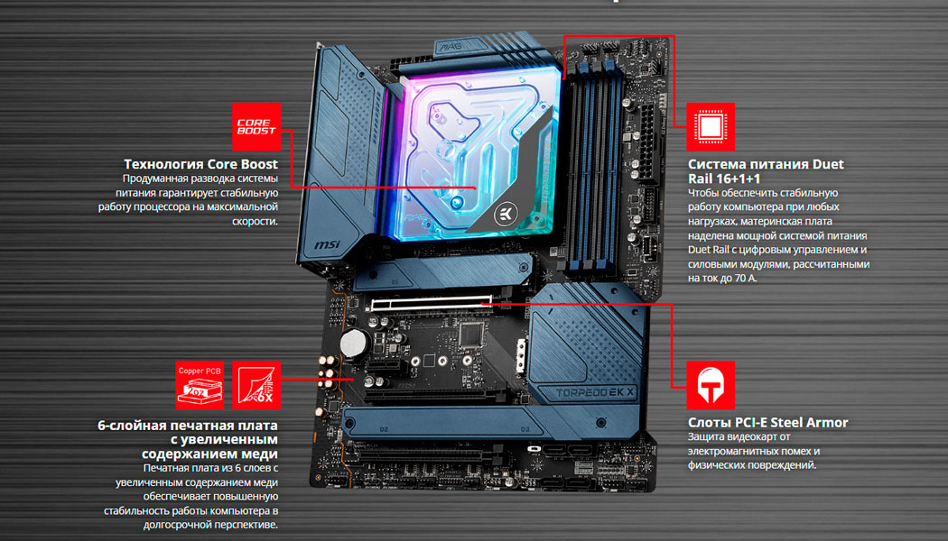 Специалисты MSI имеют огромный опыт по разработке высокопроизводительных материнских плат. Они отбирают лучшие схемы и компоненты, чтобы создавать устройства, способные надежно работать даже в самых экстремальных условиях.