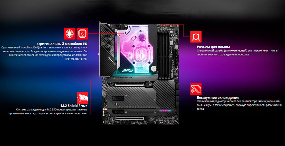 Для удержания температуры компонентов на надлежащем уровне на материнскую плату устанавливается оригинальный кулер EK, который обслуживает и процессор, и силовые элементы. Данная система водяного охлаждения гарантирует стабильную работу компьютера под высокими игровыми нагрузками при минимальном уровне шума.