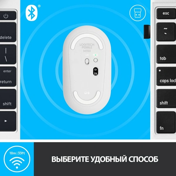Минимализм, современный дизайн и бесшумная работа — эти три понятия отныне характеризуют ваше рабочее пространство. Представляем Logitech Pebble M350 — портативную мышь, которая поможет справиться с любым заданием и станет вашим надежным спутником везде, куда бы вы ни отправились. Конструкция мыши с плавными очертаниями разработана таким образом, чтобы устройство легко помещалось в кармане или сумке и максимально комфортно располагалось в ладони. Механизмы кнопок и колесика прокрутки работают абсолютно бесшумно, поэтому вы сможете эффективно работать, не мешая окружающим.