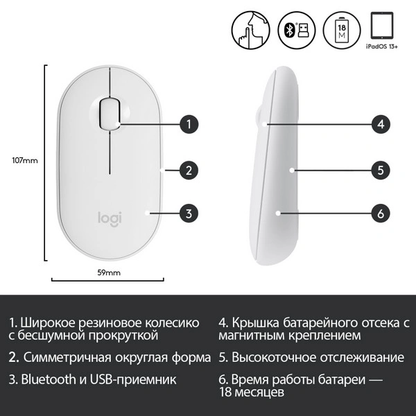 Подключайтесь к компьютеру, ноутбуку или планшету с помощью интерфейса Bluetooth® либо миниатюрного USB-приемника, хранящегося под магнитной крышкой мыши, и работайте в свое удовольствие: качество связи с радиусом действия до 10 м исключает возникновение перебоев и задержек.2Радиус действия беспроводной связи зависит от окружающих условий и конфигурации компьютера.. Поддерживаются операционные системы Windows®, macOS, Chrome OS™ и iPadOS.