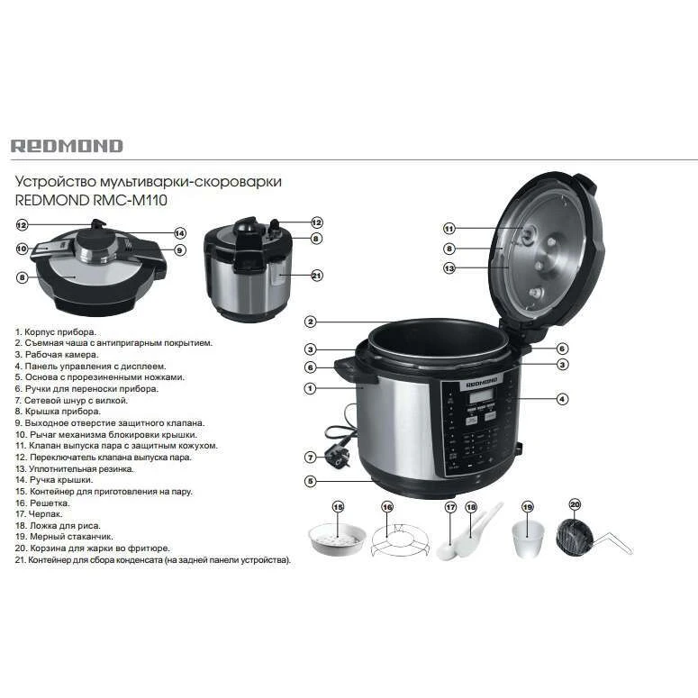 Мультиварка-скороварка REDMOND RMC-M110 оснащена многоуровневой системой защиты. При использовании устройства в качестве скороварки выбранный режим заработает только после закрытия крышки, при этом крышка будет заблокирована. Если давление в рабочей камере превысит допустимый предел, автоматически откроется пружинный клапан сброса давления. При превышении в рабочей камере заданного значения температуры специальный ограничитель прерывает работу нагревательного элемента до тех пор, пока температура не опустится ниже необходимого уровня. На случай критических сбоев в работе мультиварки-скороварки прибор снабжен дополнительными механизмами сброса давления и защиты прибора от перегрева.