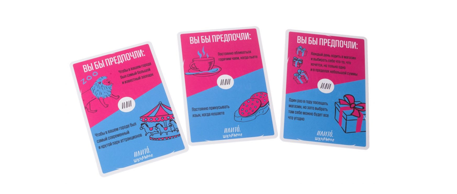 Простая и увлекательная игра, которая научит школьников рассуждать, спорить, дискутировать и размышлять на самые разные, порой даже фантастические, темы. Компактная игра с очень простыми правилами, которая заставит всех — от двоечника до отличника — задуматься над тем, что бы они выбрали: уметь проходить сквозь стены или уметь передвигать предметы на расстоянии? Игра содержит 60 карточек, каждая из которых ставит игроков перед крайне непростым выбором.