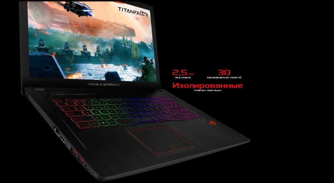 Клавиатура ноутбука ROG Strix GL753 оптимизирована специально для геймеров, поэтому группа клавиш WASD, традиционно используемая для навигации в игре, ярко выделена. Прочная и эргономичная, эта клавиатура оснащается клавишами ножничного типа с оптимальным ходом (2,5 мм) и четырехзонной RGB-подсветкой, которая позволит с комфортом играть даже ночью. Для удобства игры пробел клавиатуры имеет увеличенную площадь, а клавиши навигации отделены от остальных.