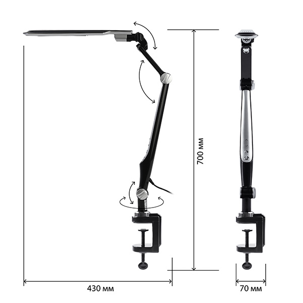 Настольный светильник ЭРА NLED-496-12W-BK с LED-источниками света обеспечивает современное и эффективное освещение. Он оснащен сенсорным управлением, позволяющим выбирать цветовую температуру (теплый, нейтральный или холодный свет) и плавно регулировать яркость с помощью диммера. Светильник сохраняет выбранные настройки при включении и выключении. Двухсекционная сгибающаяся стойка позволяет регулировать высоту плафона, а направление света можно менять путем поворота и наклона плафона в любую сторону. Удобное крепление на струбцину обеспечивает надежное фиксирование на любой плоской поверхности.