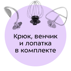 Крюк для теста - идеален для замешивания густого теста. Венчик для взбивания - идеален для взбивания яичных белков, сливок, замешивания жидкого теста. Насадка для перемешивания - идеальна для смешивания негустых ингредиентов.