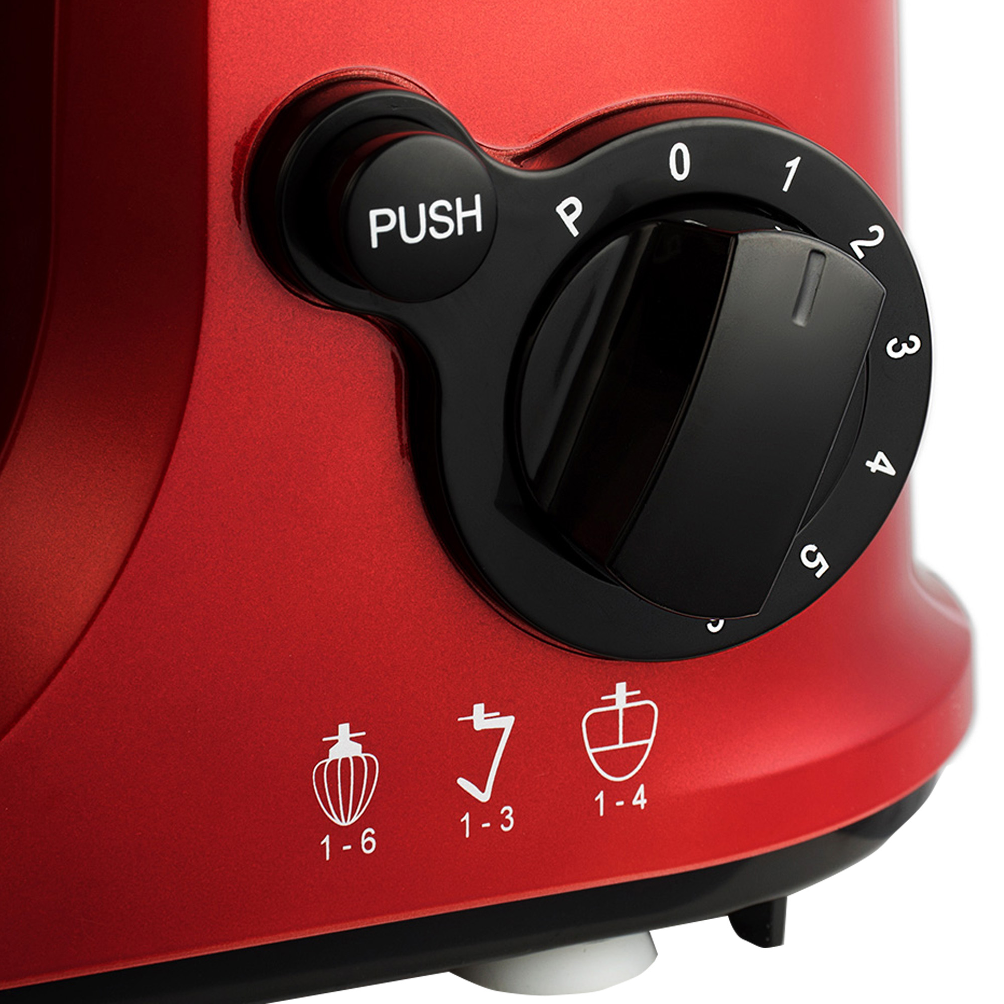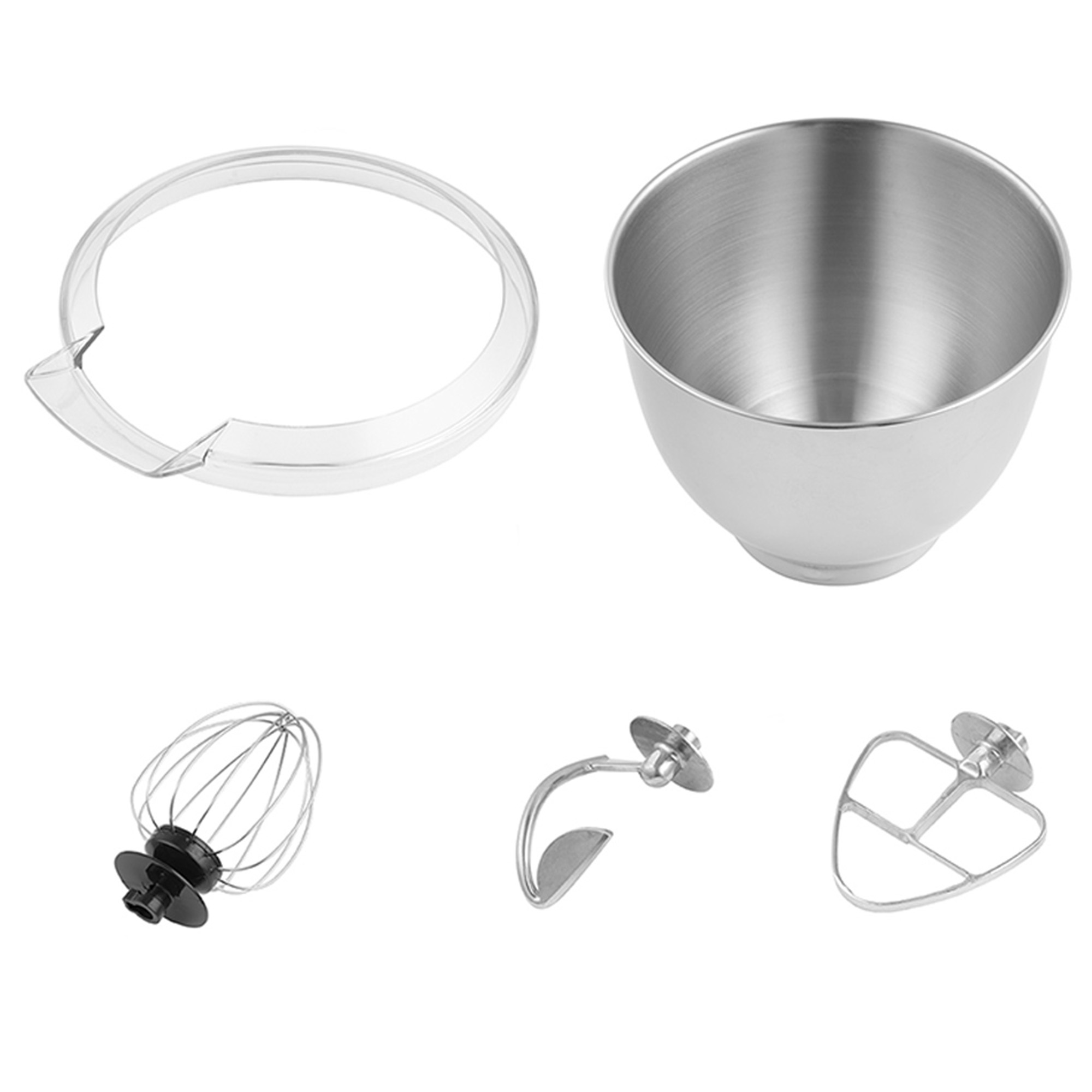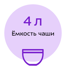 Миксер оснащён вместительной чашей 4л. Форма насадок и чаши подобраны так, что при любом количестве продуктов насадка не оставляет их по краям не перемешанными.