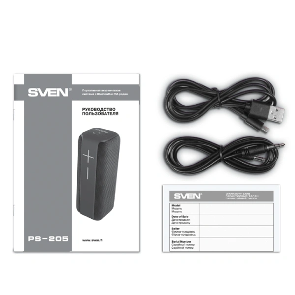 Портативная колонка, инструкция, упаковка, гарантийный талон, кабель USB к micro USB, кабель mini-jack 3.5мм, справочник.